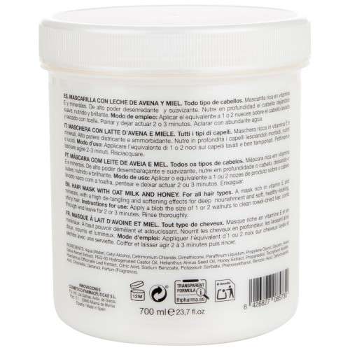 La Thader TH Pharma Mascarilla con Leche de Avena y Miel en formato 700 ml es la opción más económica y generosa de la línea, diseñada para quienes quieren mantener una rutina de cuidado capilar completa sin renunciar a la calidad farmacéutica de la marca. Su fórmula nutritiva y suavizante combina los beneficios de dos ingredientes naturales con gran tradición en el cuidado del cabello: la leche de avena y la miel.